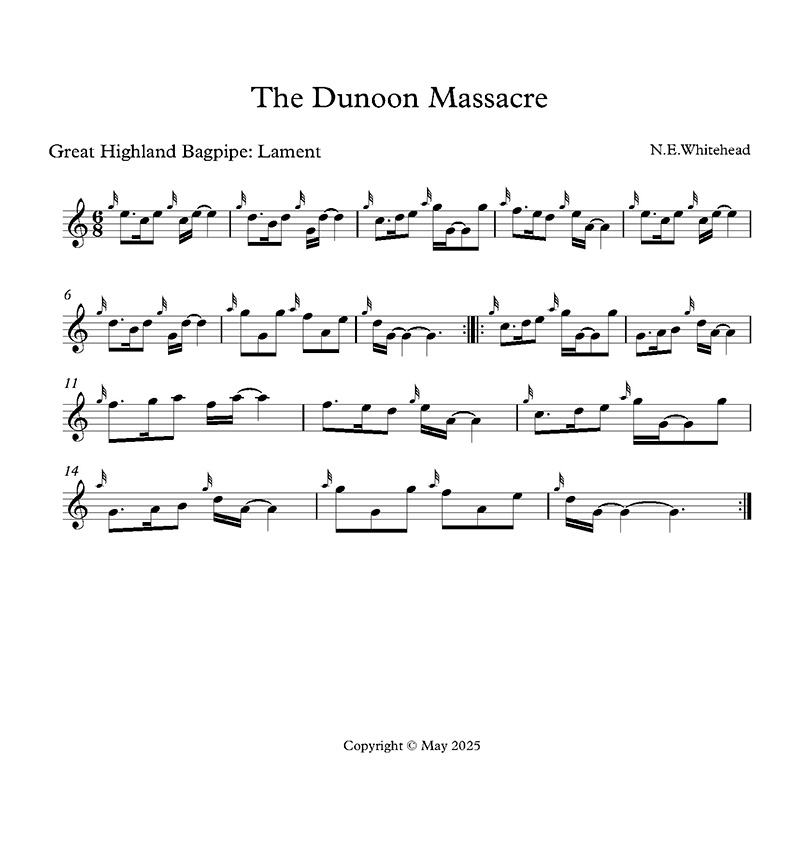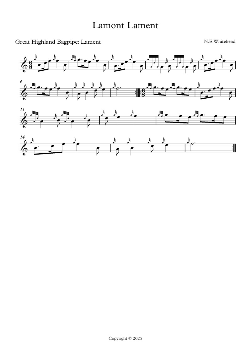 A companion piece to the Lamont Lament below, this lament remembers the Dunoon massacre in 1642. It is traditional for Scottish pipetunes to commemorate battles.