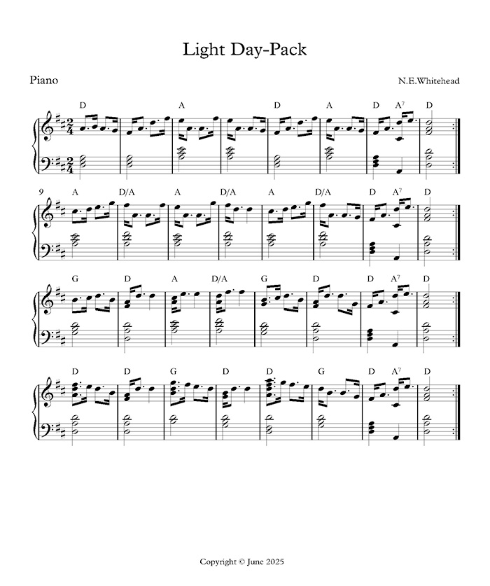 A happy little piece that trips along - like a hiker on a rural trail with a light day pack and a happy heart. He might be whistling, he might have his dog with him and the wildflowers might be in bloom. This is for the keyboard rather than the pipes