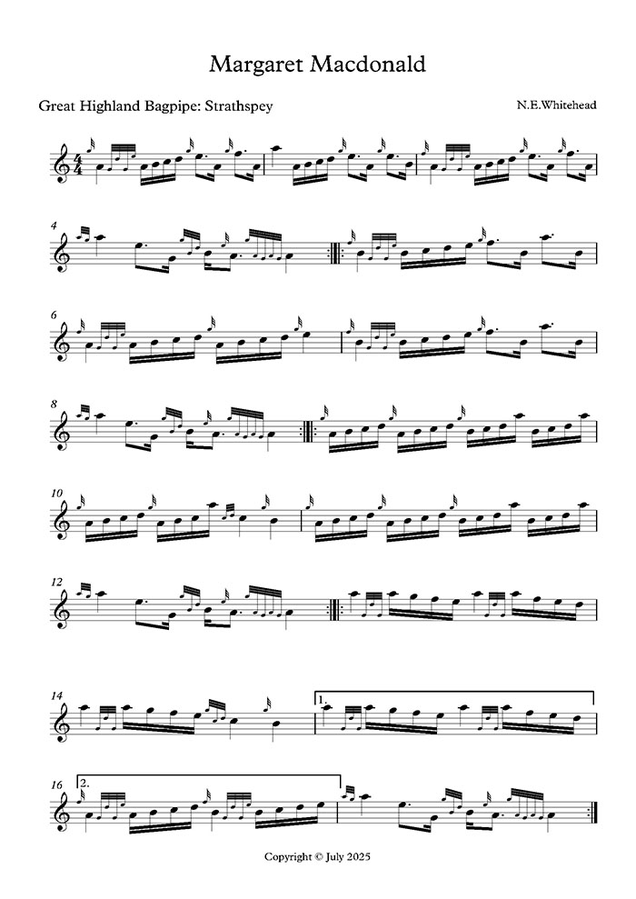The piece is in the traditional strathspey style except that the standard triplets have been replaced by quadruplets – an innovation.